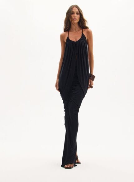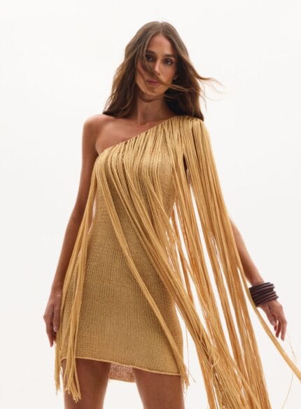 Inspiração & Materiais: resortwear com linho e malhas suaves, tule leve e viscose/modal; drapeados precisos, babados discretos e metais orgânicos em paleta natural (areias, verdes, terrosos e solares).
