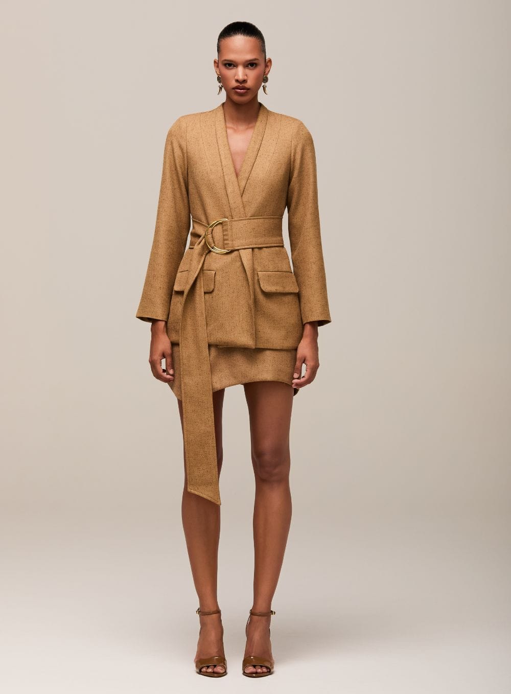 O grande protagonista é o cinto do próprio tecido com maxi fivela de metal. Ele não apenas marca a cintura, criando uma silhueta feminina (\\\”ampulheta\\\”), mas também atua como um acessório de joalheria na roupa, dispensando complementos exagerados.