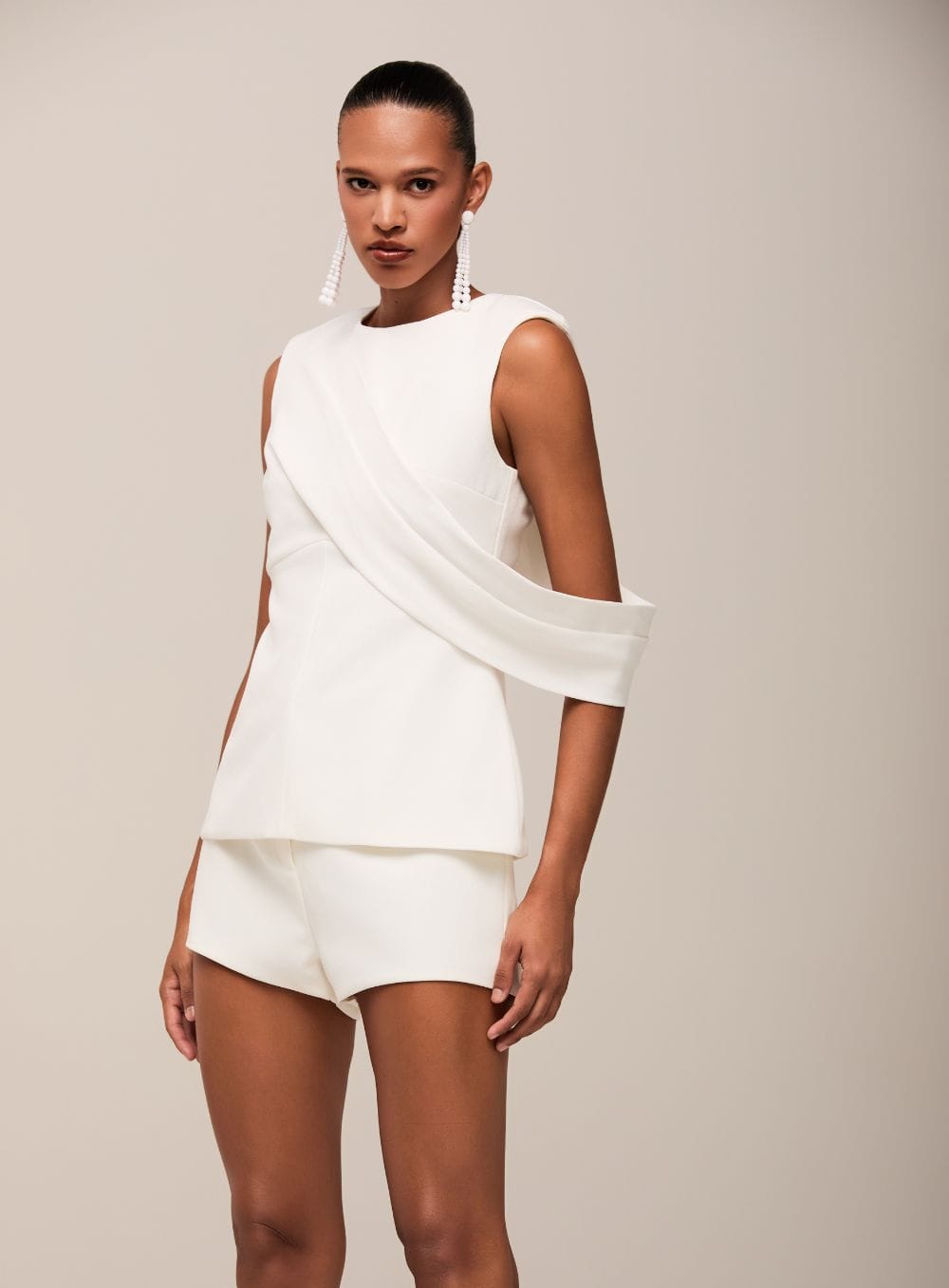Detalhe Chave: Drapeado assimétrico feito em moulage.