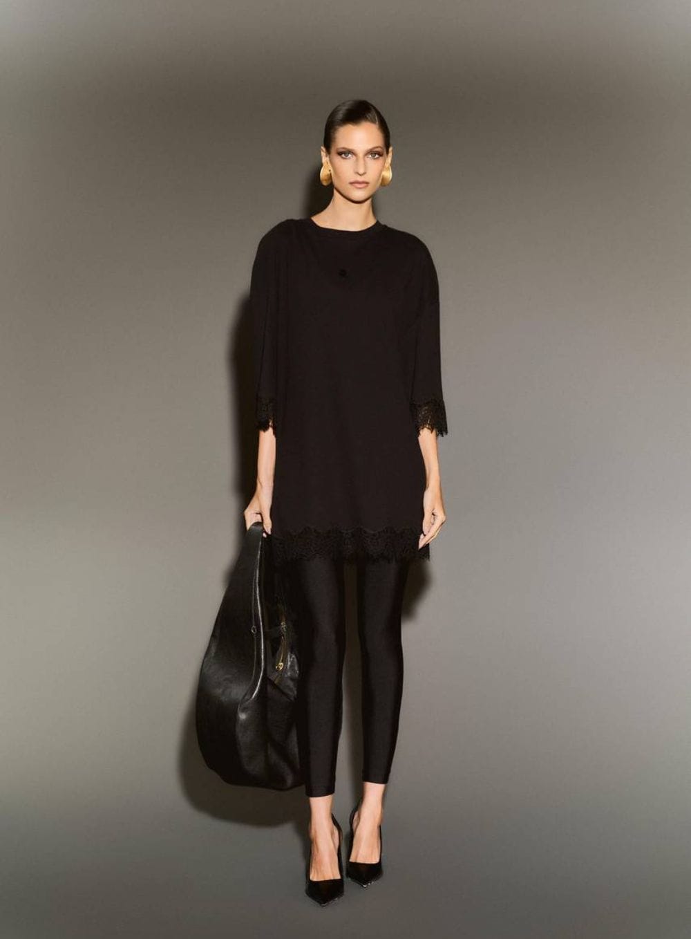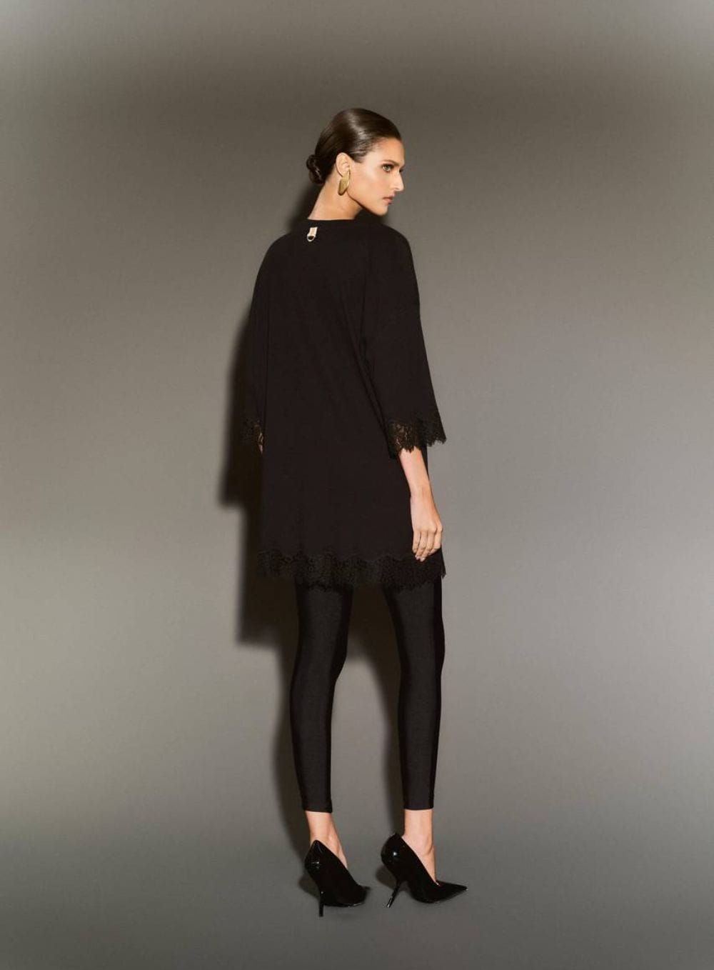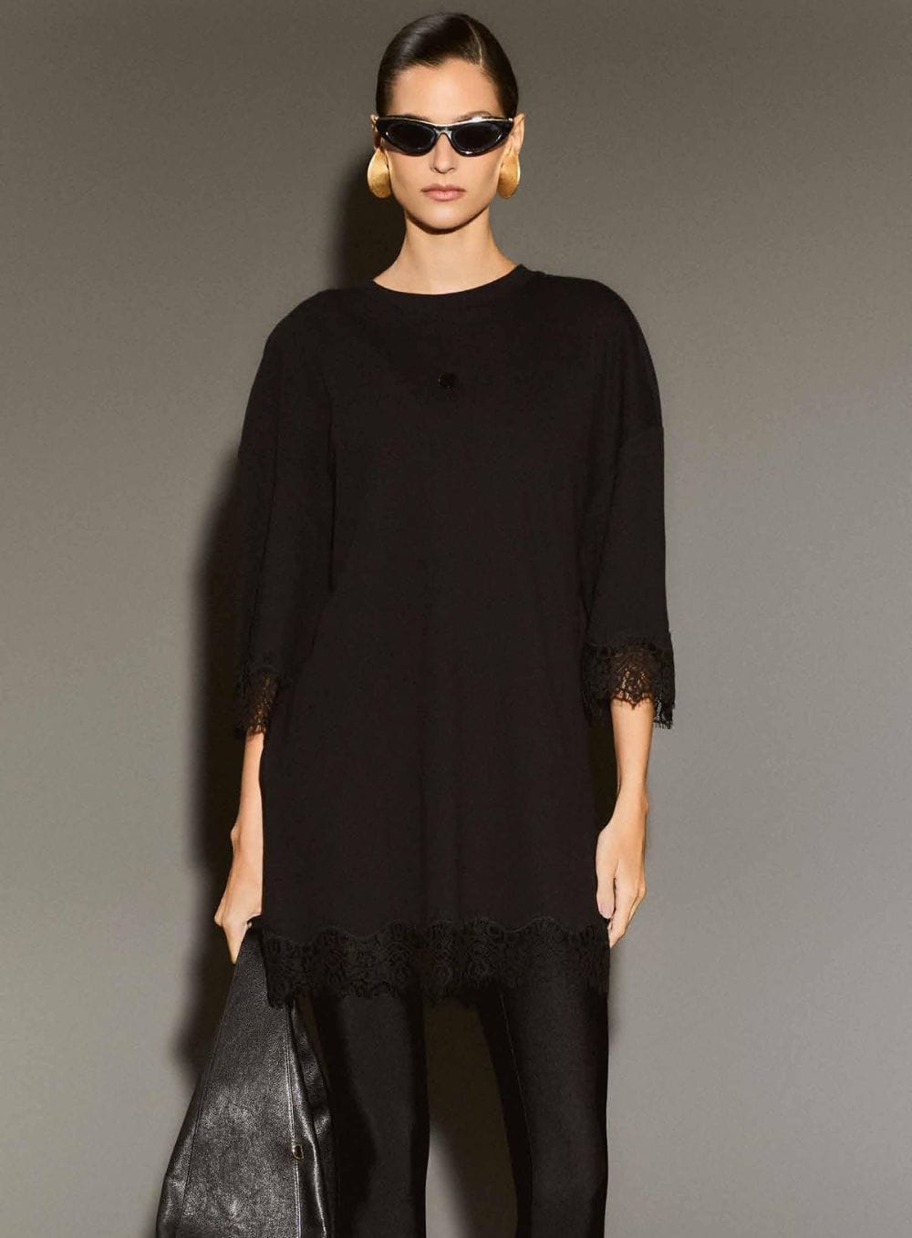 T-Shirt Túnicaem Algodão Premium com Barra de Renda – Black Noir