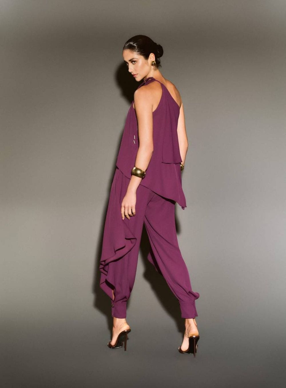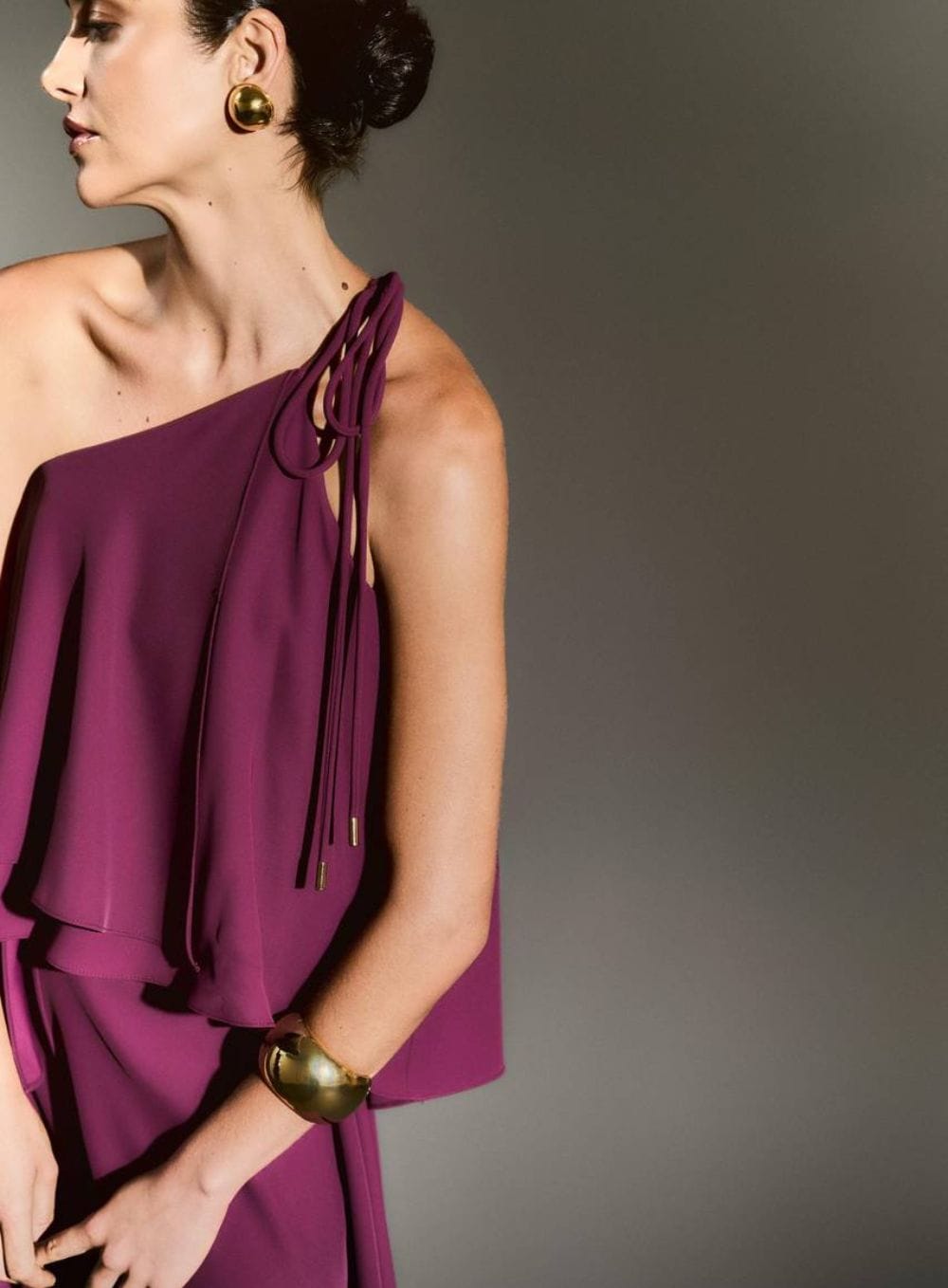 O design de um ombro só é o protagonista, trazendo sensualidade ao destacar o colo. Porém, o diferencial está na construção frontal: camadas sobrepostas com recortes diagonais criam um efeito cascata suave. Isso não é apenas estético; essa sobreposição estratégica oferece movimento ao caminhar e disfarça sutilmente o relevo do corpo, garantindo um caimento impecável e fluido.