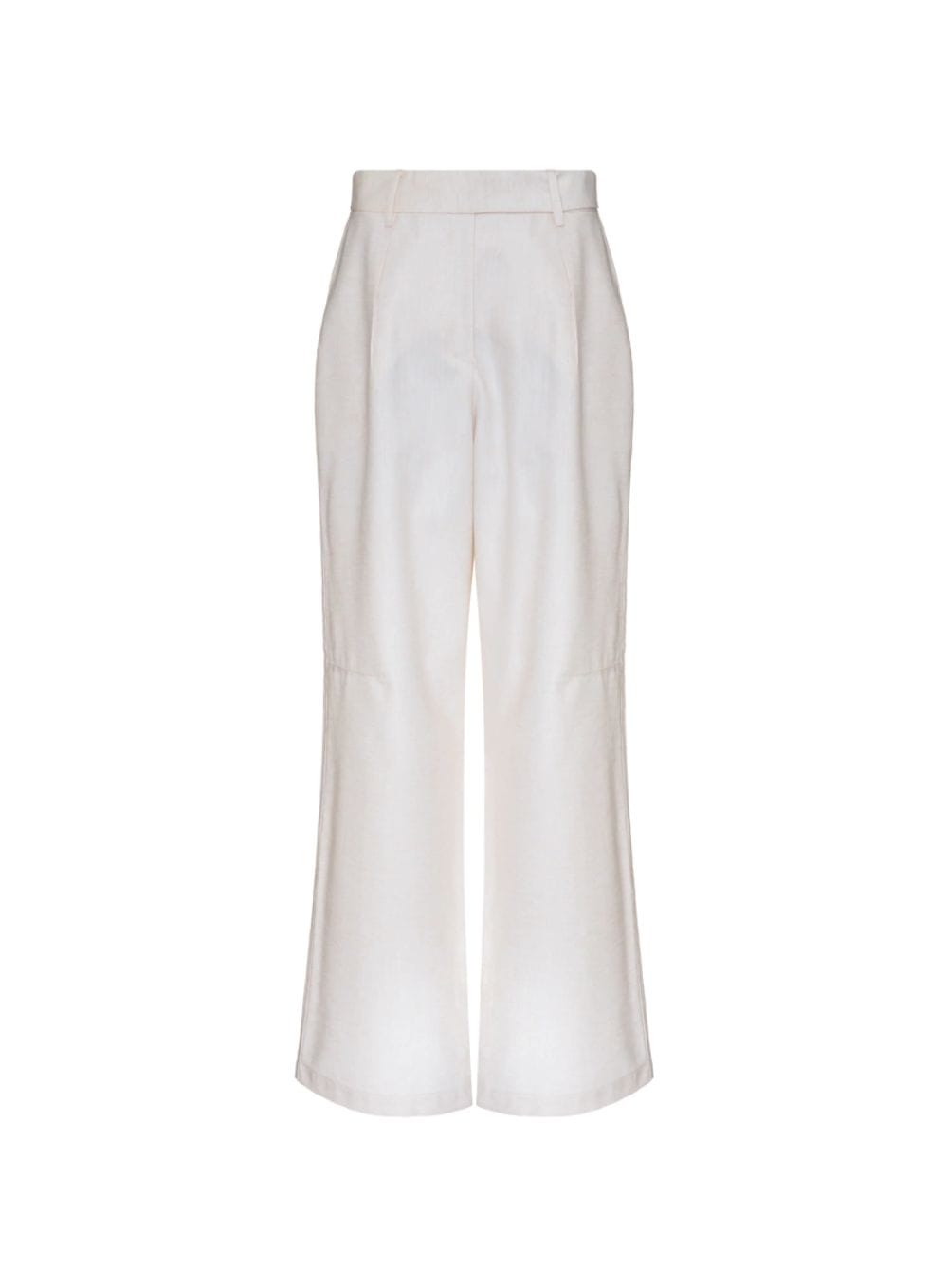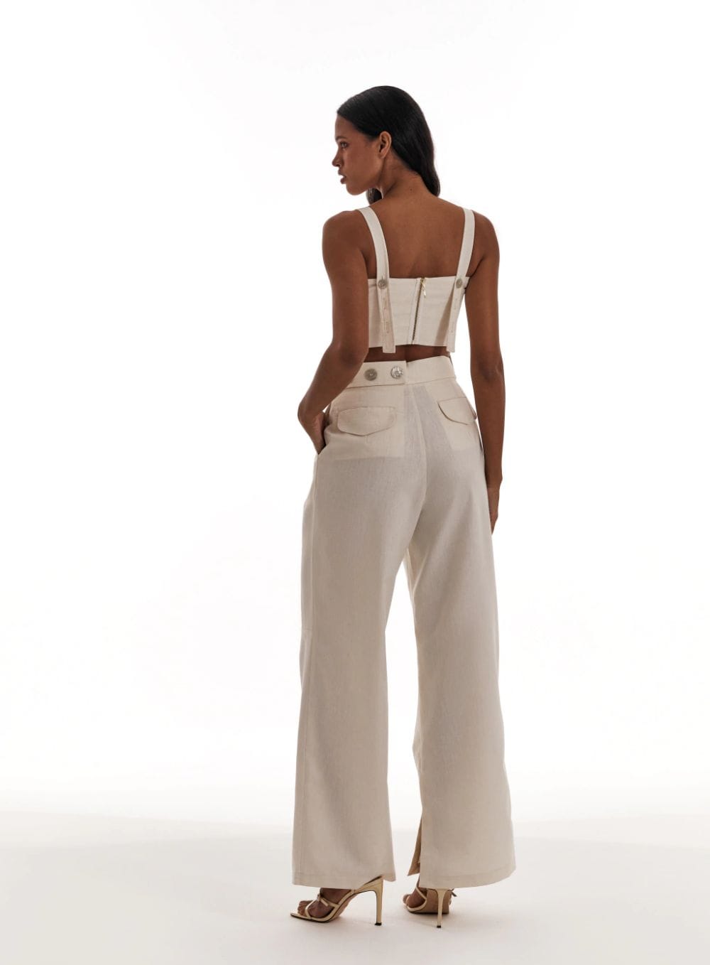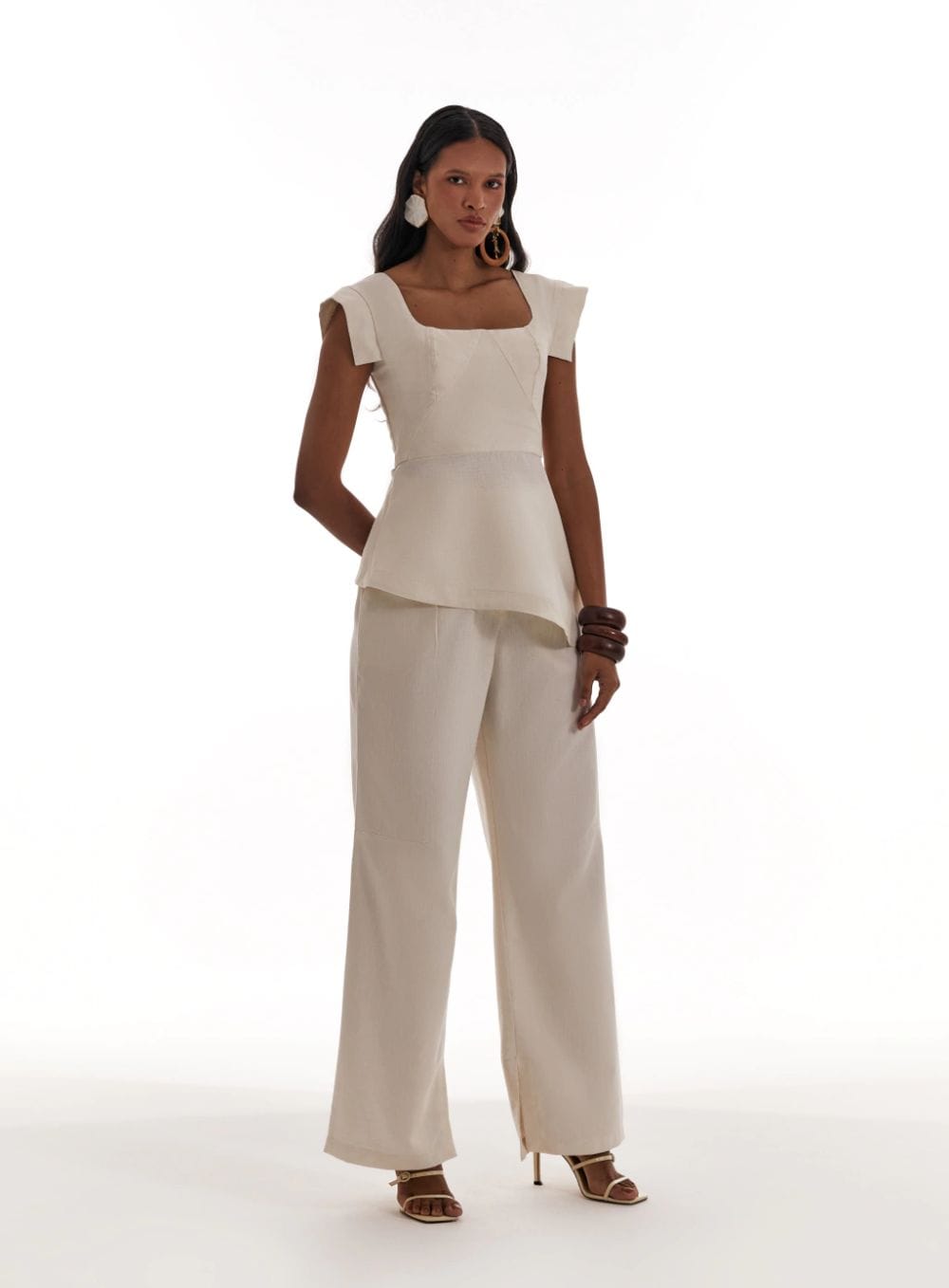 A Calça Carol é confeccionada em tecido plano, possui modelagem reta, clássica de alfaiataria, cintura regular, bolso faca, pregas na frente, pences nas costas e barra larga pespontada com fenda. Fechamento por botões madrepérola e braguilha.