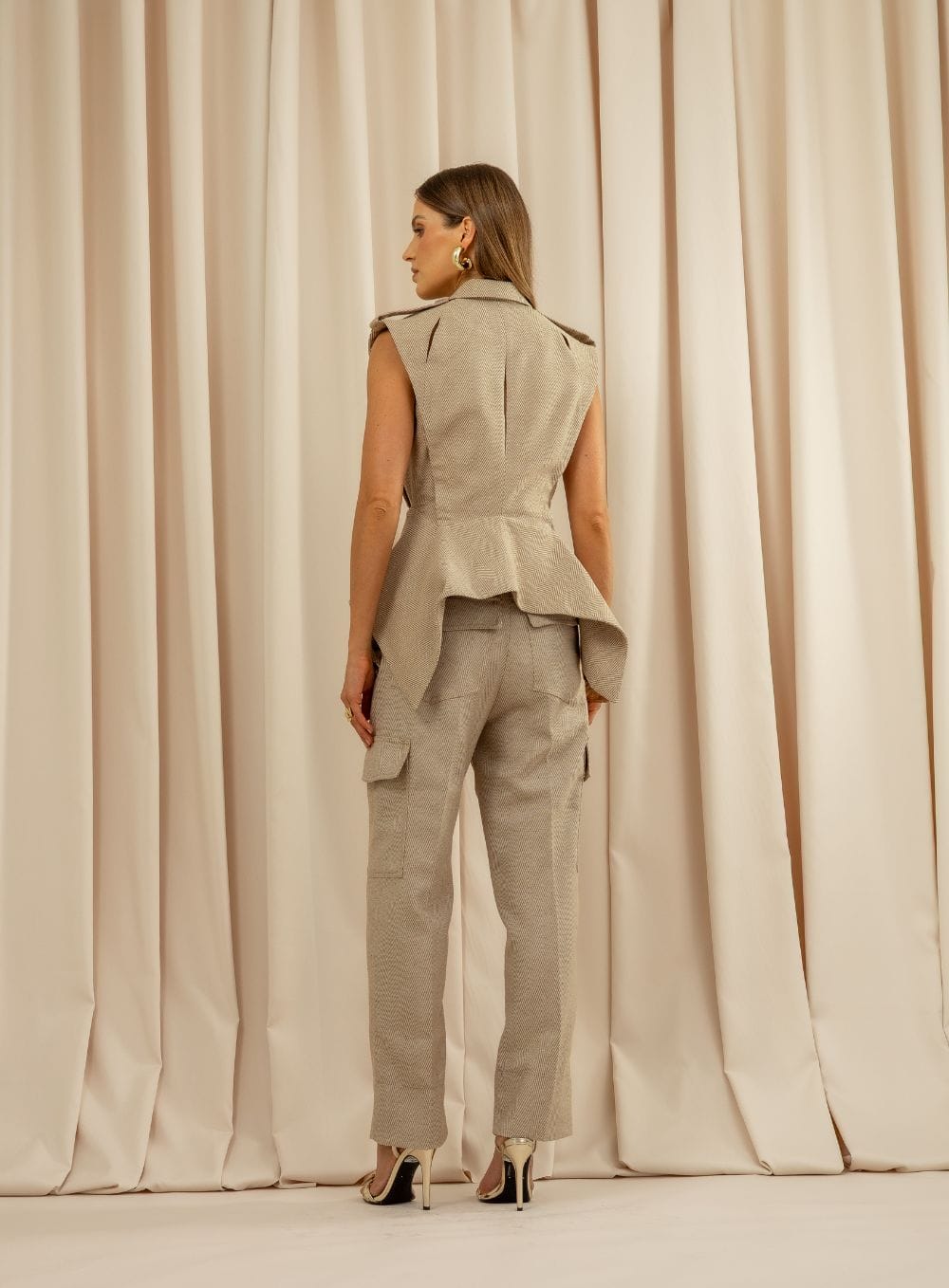 A Calça Elise apresenta uma alfaiataria moderna e versátil. Com modelagem reta, bolsas laterais estilo cargo e lapelas frontais e traseiras, é uma peça que tem funcionalidade e funcionalidade, ideal para quem busca um visual contemporâneo.