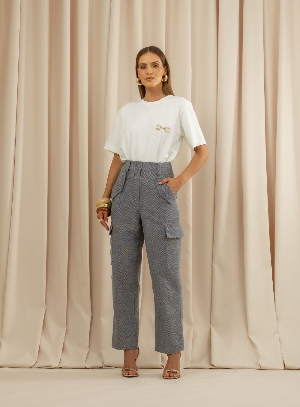 A Calça Elise apresenta uma alfaiataria moderna e versátil. Com modelagem reta, bolsas laterais estilo cargo e lapelas frontais e traseiras, é uma peça que tem funcionalidade e funcionalidade, ideal para quem busca um visual contemporâneo.