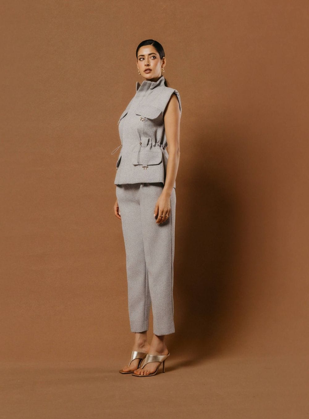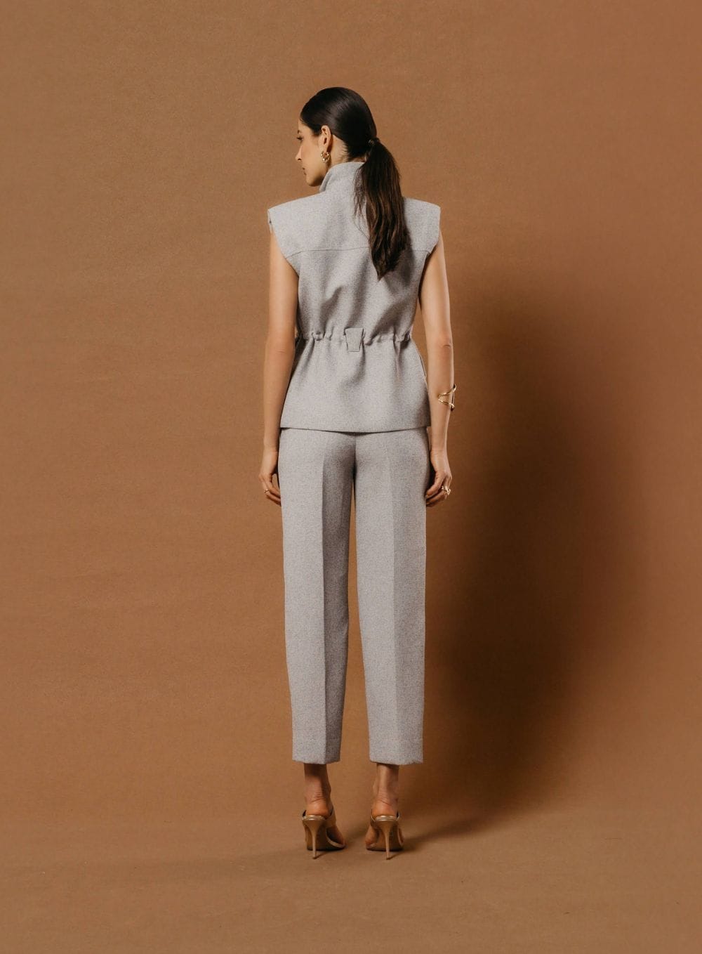 O Conjunto Perfeito: Use com o Colete Helena para um visual monocromático e texturizado que é puro sinônimo de sofisticação.
