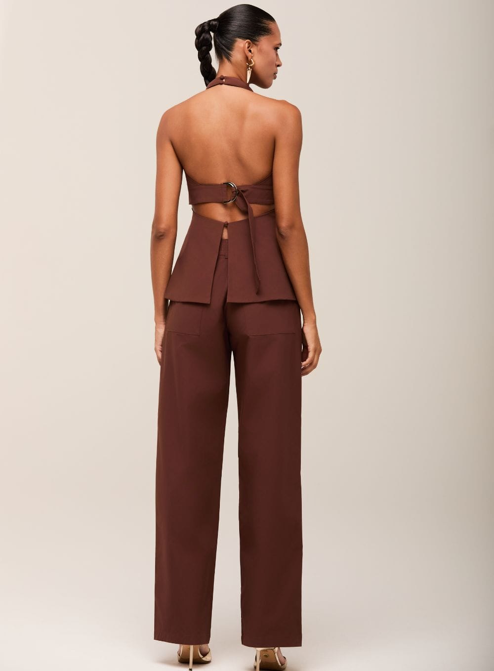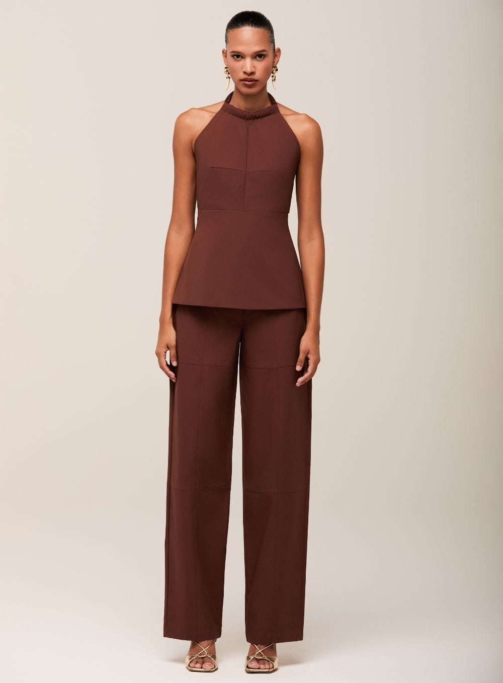 A modelagem reta (straight leg) é um clássico que nunca sai de moda, mas trouxemos uma atualização arquitetônica: recortes estratégicos ao longo da perna. Esses detalhes sutis alongam a silhueta visualmente e conferem um ar de design moderno, tirando a peça do lugar-comum da \”calça de escritório\”.