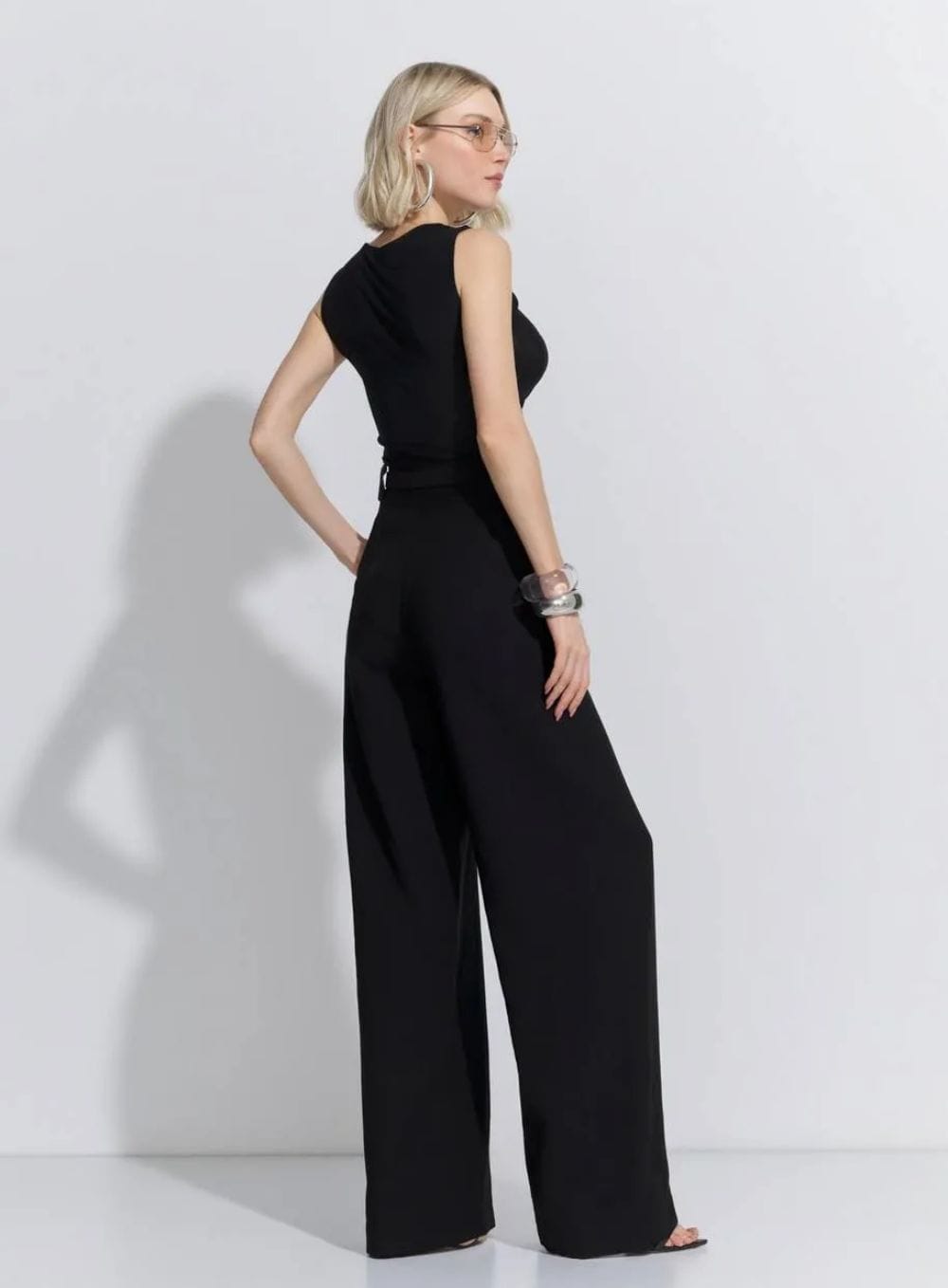 Com caimento impecável, a calça preta em alfaiataria é sinônimo de sofisticação atemporal. O shape wide leg alonga a silhueta, enquanto o cinto forrado traz acabamento refinado. Os bolsos faca e as nervuras frontais elevam o visual com discrição e elegância. Combine com body ou camisa de seda para um look noturno certeiro. Vai bem com salto alto e acessórios dourados.