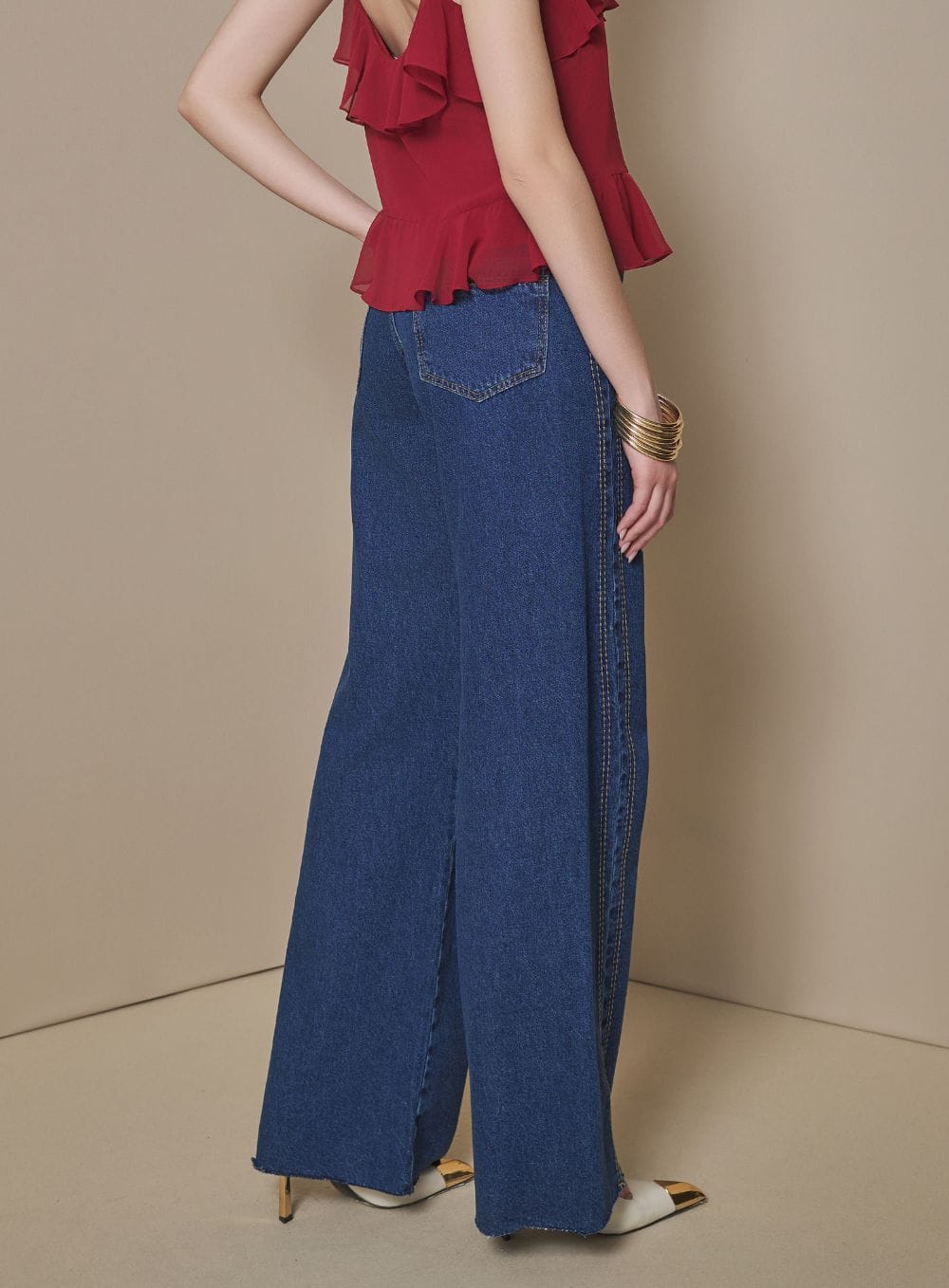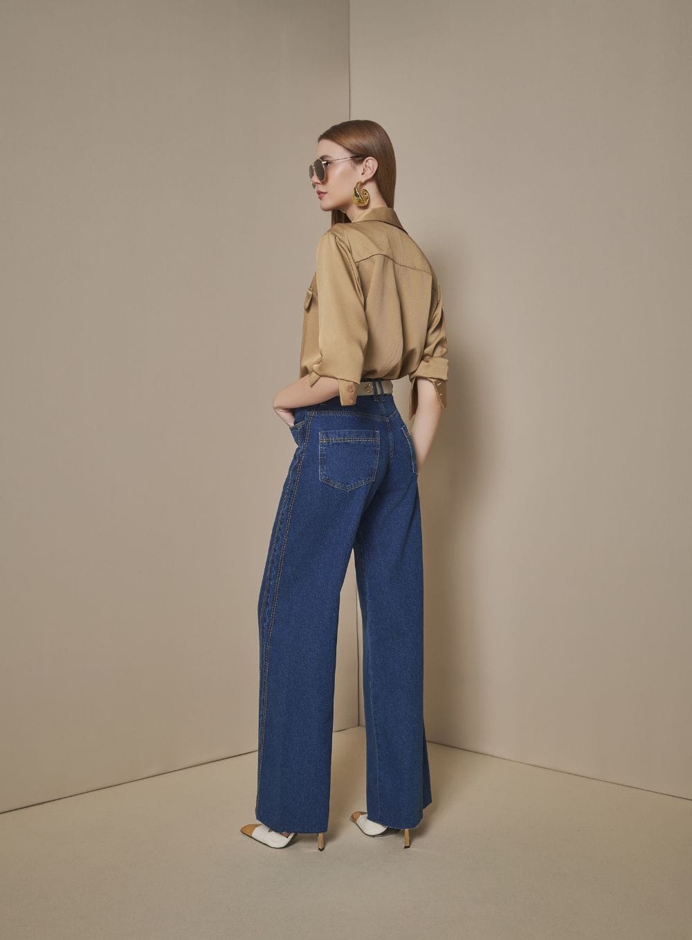 O jeans abandona o território do básico para se tornar um verdadeiro manifesto ultra moderno. Nesta versão blue denim, a calça wide leg é a peça central que equilibra a herança do utilitário com a sofisticação da alfaiataria urbana.