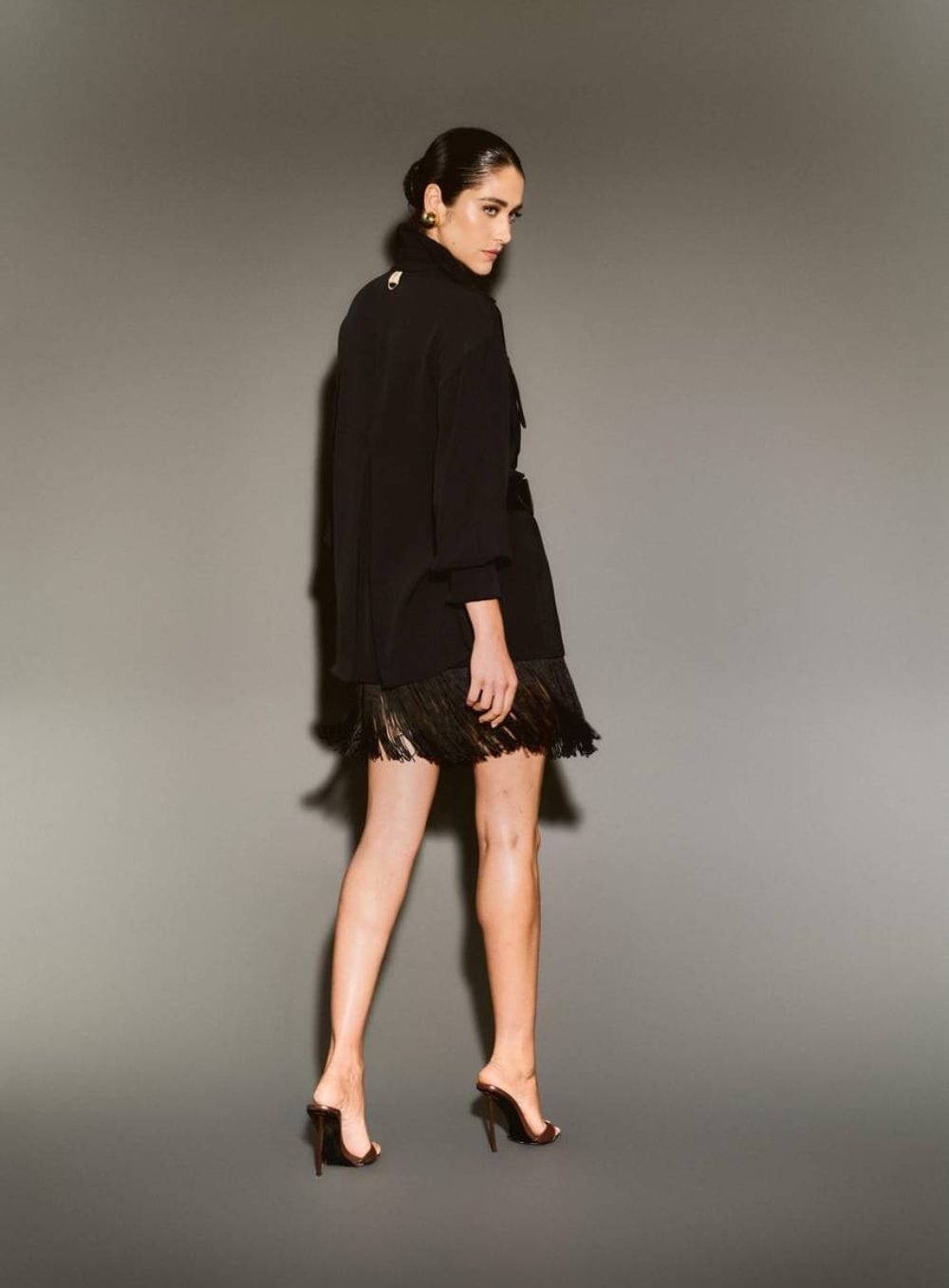 Mangas Trabalhadas: O volume das mangas é controlado estrategicamente, finalizando em pences no punho que ajustam e afinam o antebraço, garantindo elegância gestual.