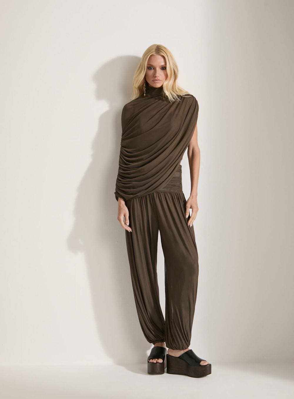 A modelagem foi pensada para criar um efeito cênico. O design assimétrico e os drapeados estratégicos no ombro e lateral fazem com que o tecido \”dance\” ao redor do corpo enquanto você caminha. A gola alta finaliza a peça com um toque aristocrático, alongando visualmente o pescoço e dispensando o uso de colares pesados — a própria capa é o acessório.