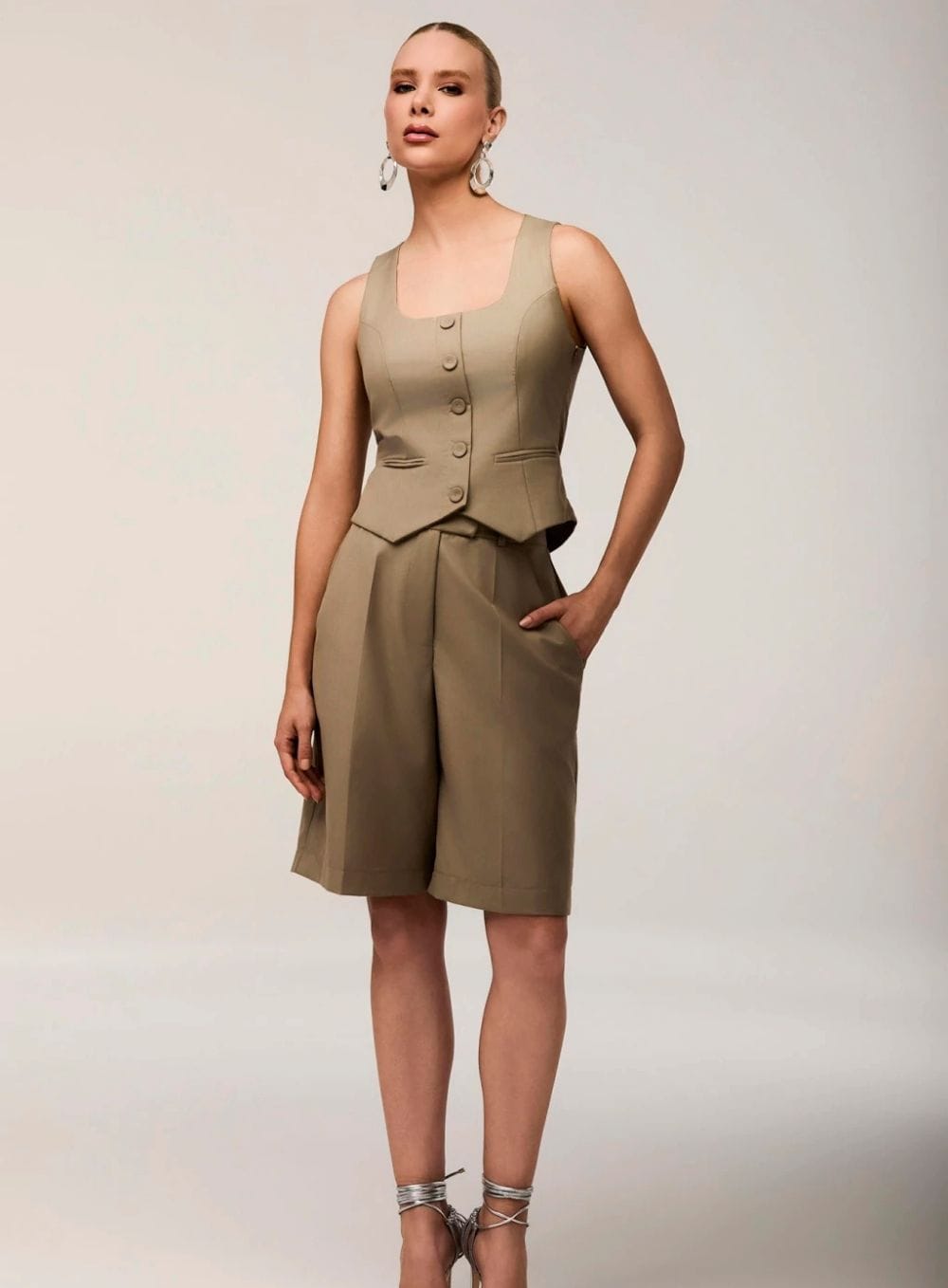 O Colete Luna é a releitura definitiva da alfaiataria clássica para o guarda-roupa feminino. Confeccionado em sarja 2×2 de alta estrutura, ele entrega uma silhueta acinturada e impecável através de recortes estratégicos. Com construção dupla para um acabamento interno premium, a peça destaca-se pelos botões forrados decorativos que trazem um ar aristocrático, enquanto o fechamento por zíper invisível lateral mantém o design limpo e minimalista. Uma peça versátil que transita com autoridade do look casual chic às produções coordenadas de impacto.