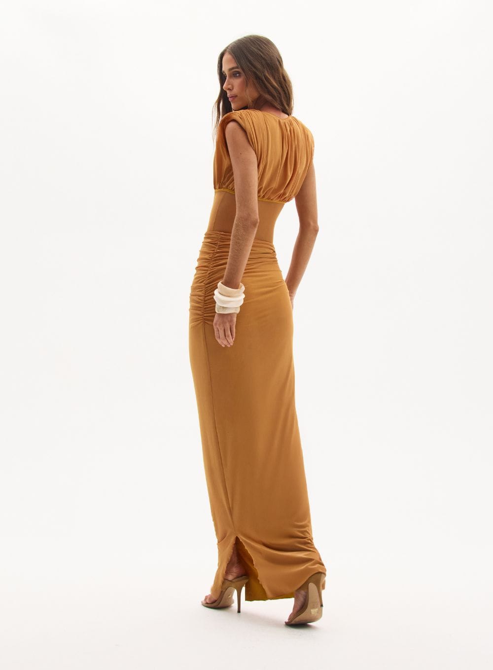Acessórios: Combine com sandálias de salto fino e os maxibraceletes orgânicos da coleção para equilibrar a modernidade dos recortes com elementos naturais.