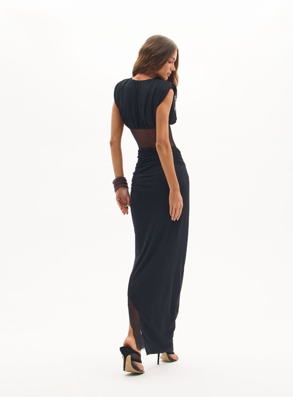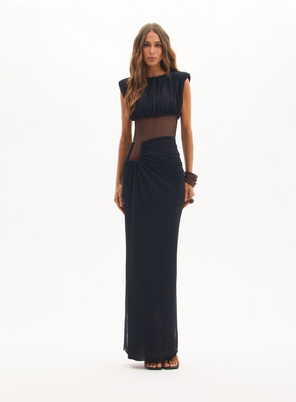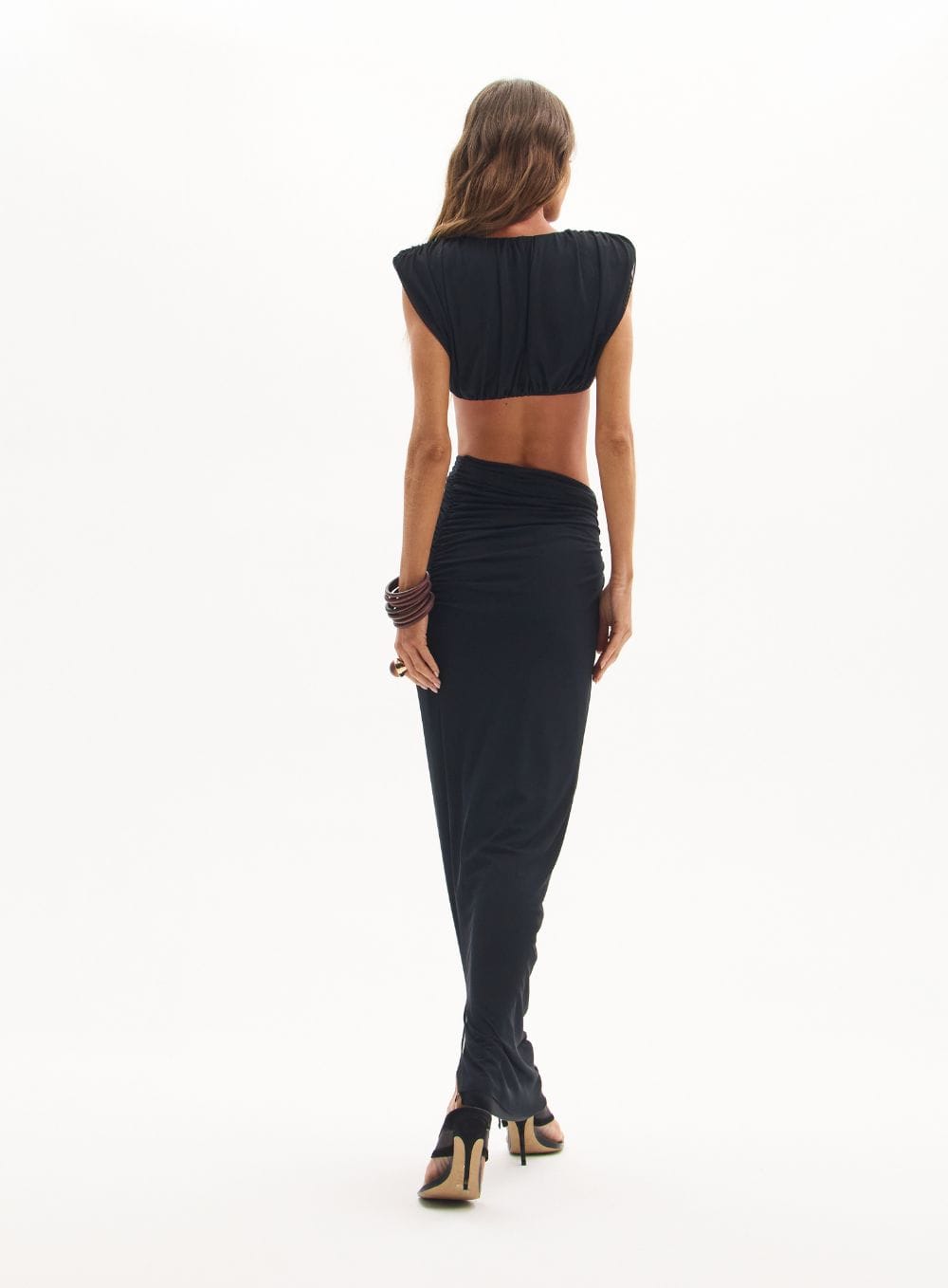 2. Acessórios: Combine com sandálias de salto fino e os maxibraceletes orgânicos da coleção para equilibrar a modernidade dos recortes com elementos naturais.