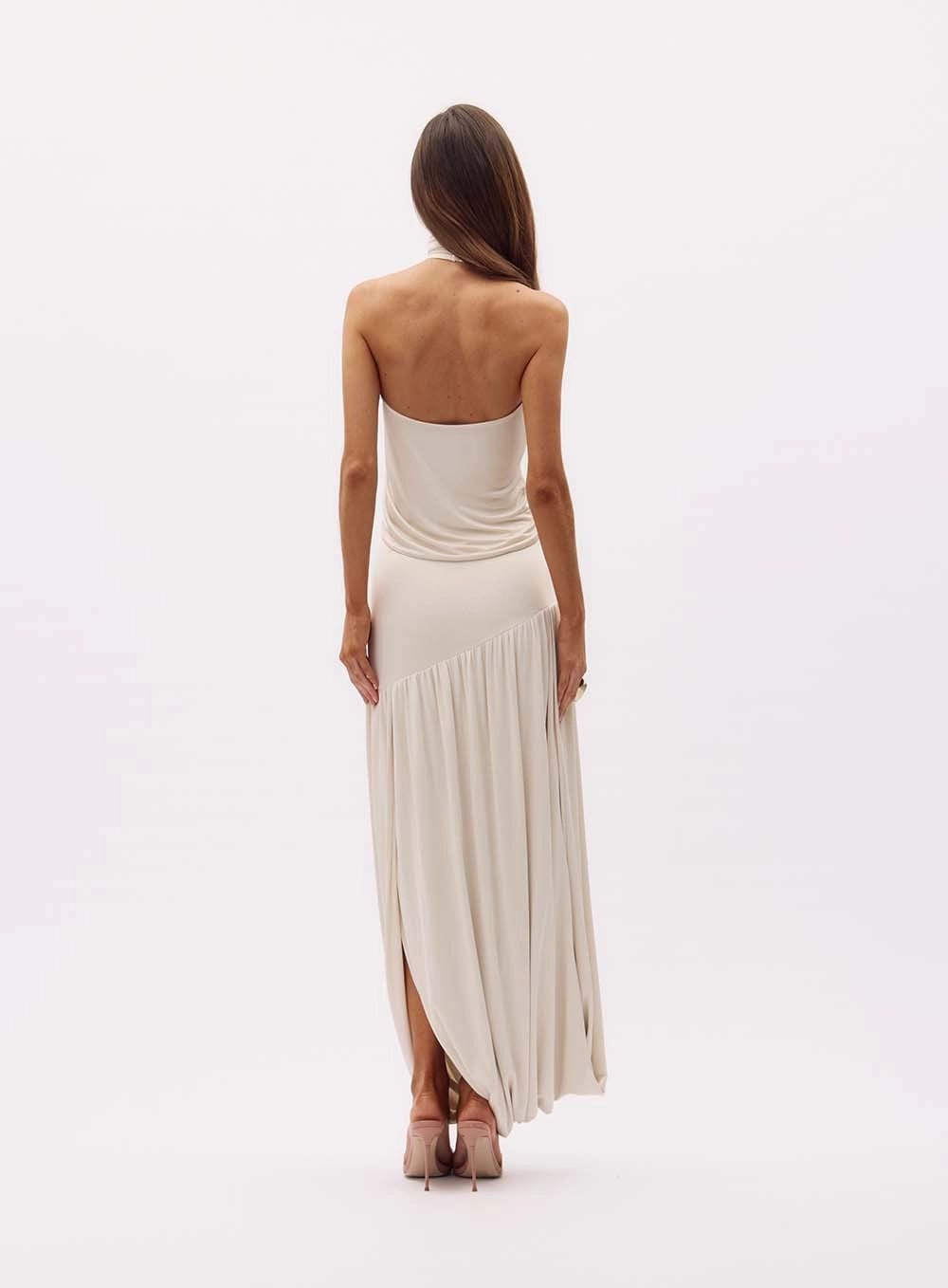 Confeccionado em tecido leve e maleável, o conjunto oferece conforto e um toque sofisticado. A cor Bege reforça a proposta clean e atemporal, ideal para ocasiões especiais.