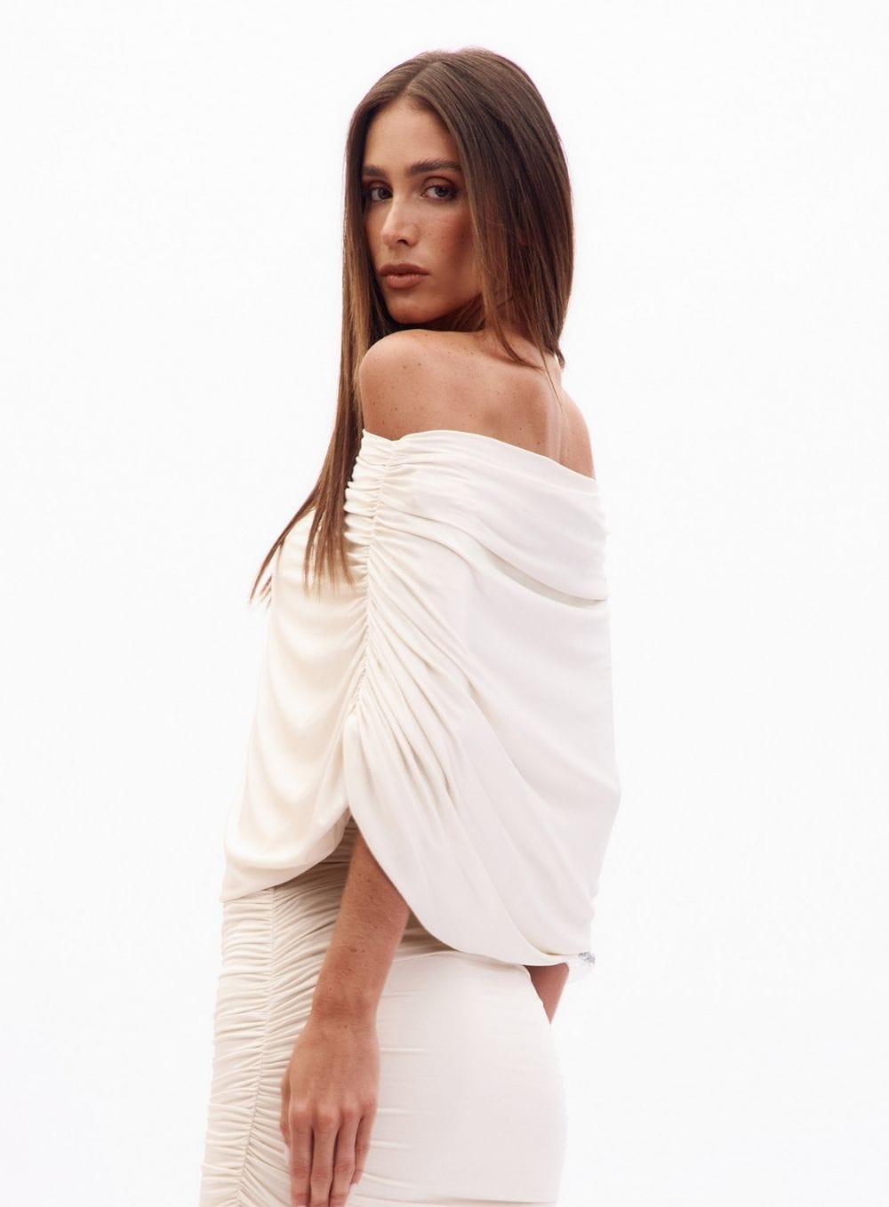 Inspiração & Materiais: resortwear com linho e malhas suaves, tule leve e viscose/modal; drapeados precisos, babados discretos e metais orgânicos em paleta natural (areias, verdes, terrosos e solares).