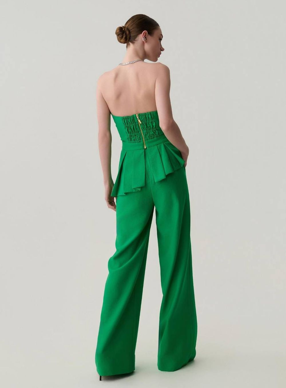 O verde traz frescor e ousadia para a peça, traduzindo modernidade sem abrir mão da elegância. O tom realça o design arquitetônico do corset e valoriza o caimento impecável da calça. Uma escolha ideal para quem deseja um look marcante e sofisticado, perfeito para festas ao ar livre ou eventos diurnos.