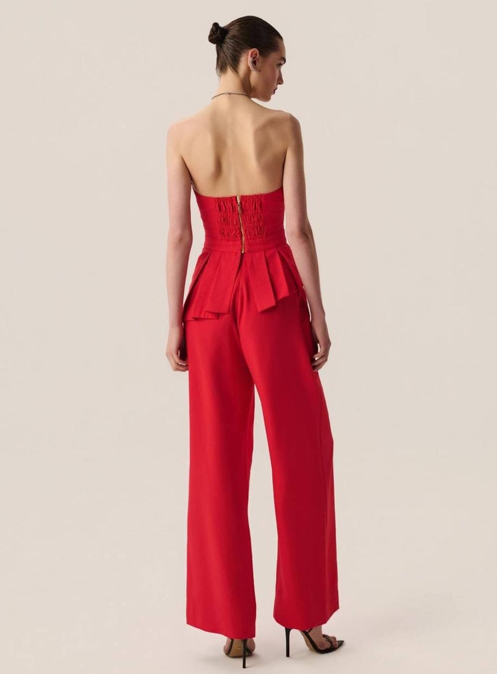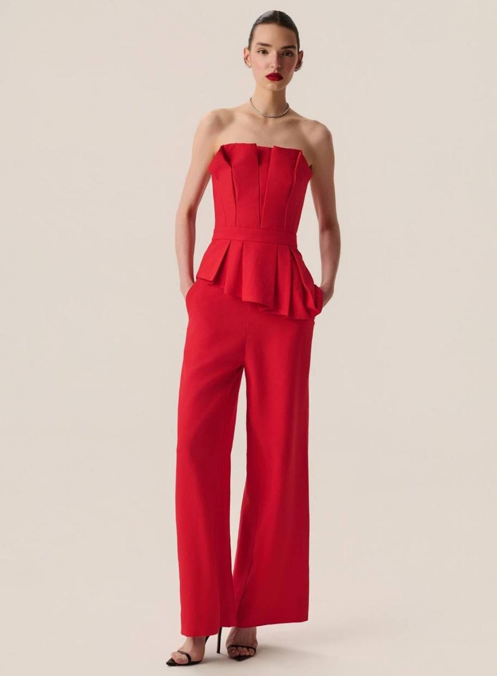 Conjunto total red em alfaiataria contemporânea, com corset estruturado e peplum assimétrico combinado à calça fluida de caimento impecável. Uma produção de impacto, pensada para alongar a silhueta e acompanhar você em eventos noturnos e ocasiões especiais com presença e sofisticação.