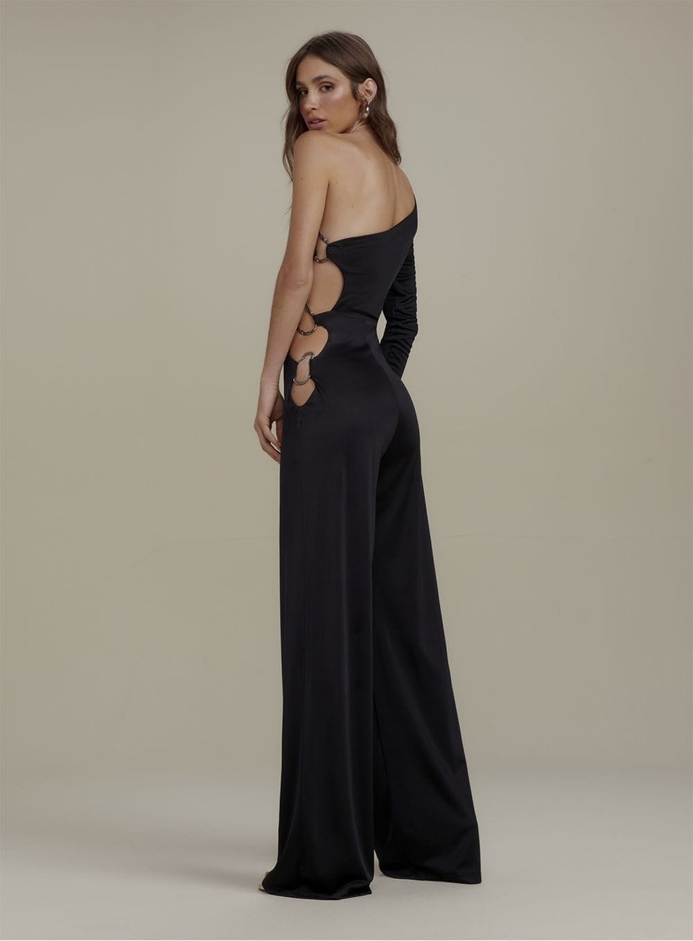 O macacão apresenta shape reto e modelagem comfy. A peça possui decote assimétrico, manga direita longa com zíper semi invisível para abertura, detalhe de recortes no lado esquerdo com aviamentos de argolas, cava esquera com elástico embutido, zíper semi lateral e comprimento longo.