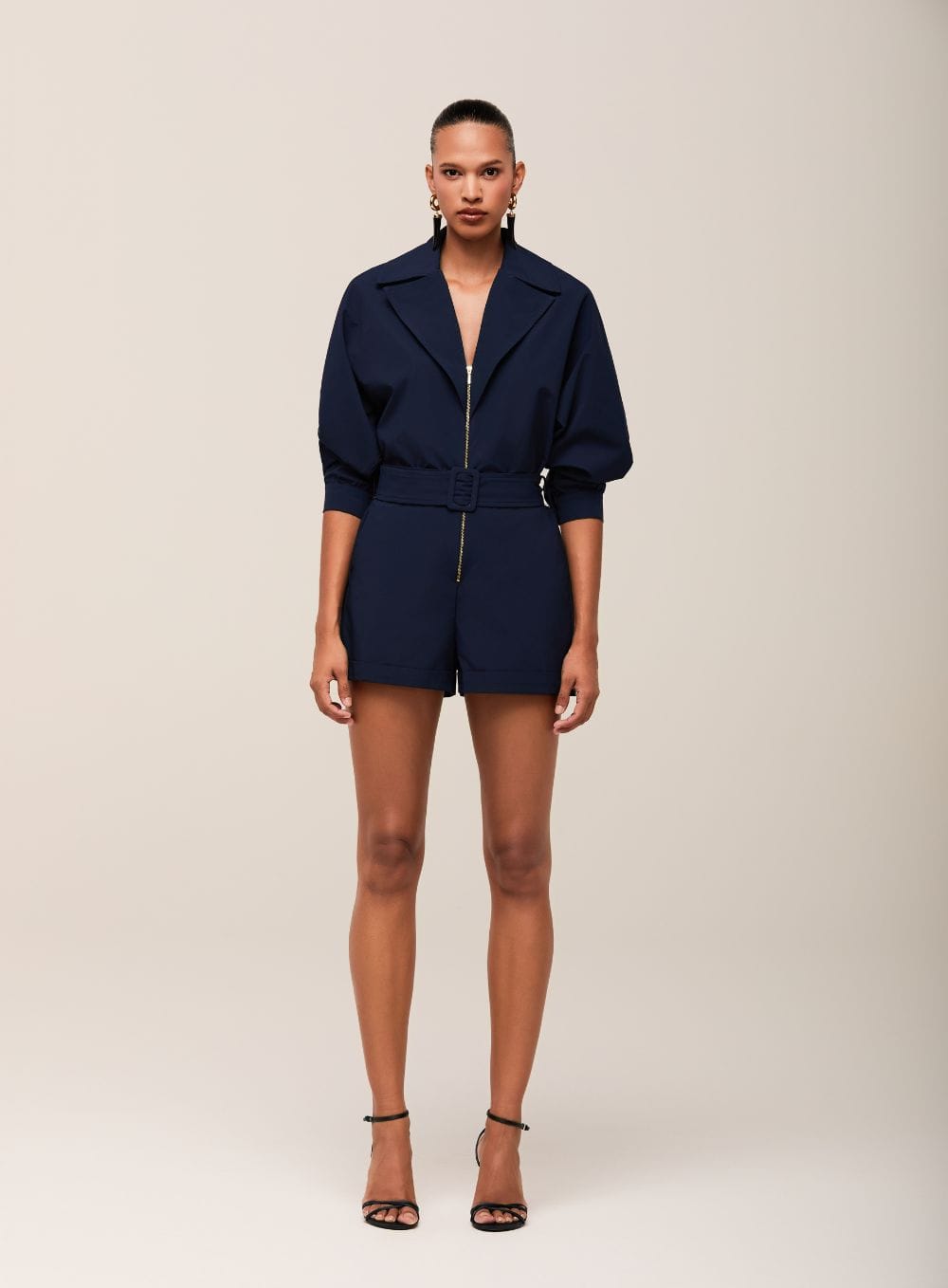 Detalhes: Maxi gola, zíper frontal metálico, mangas com volume.