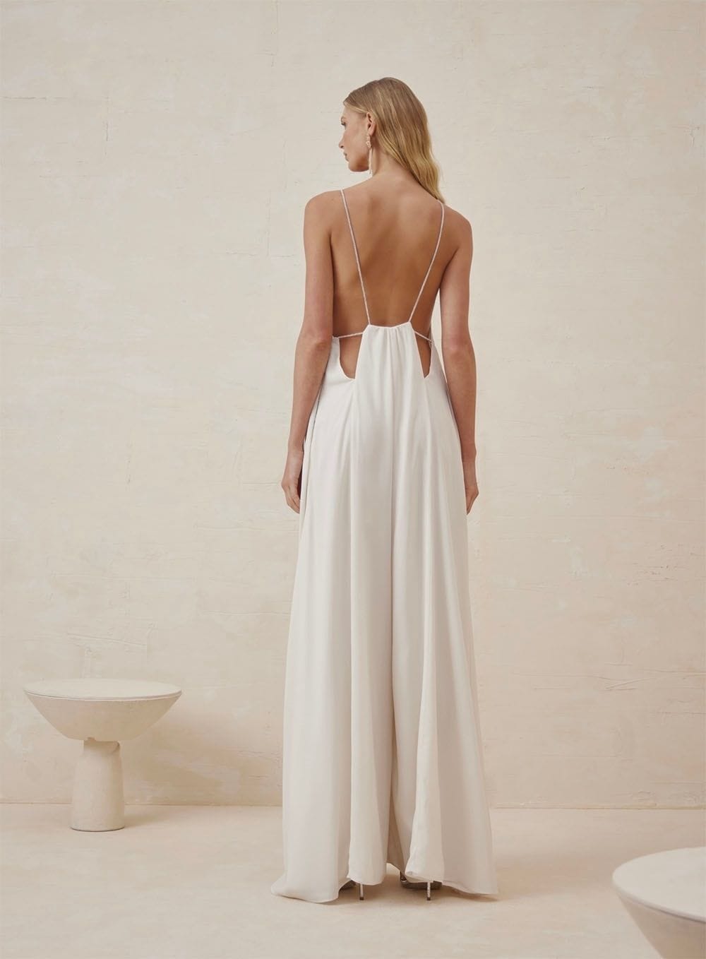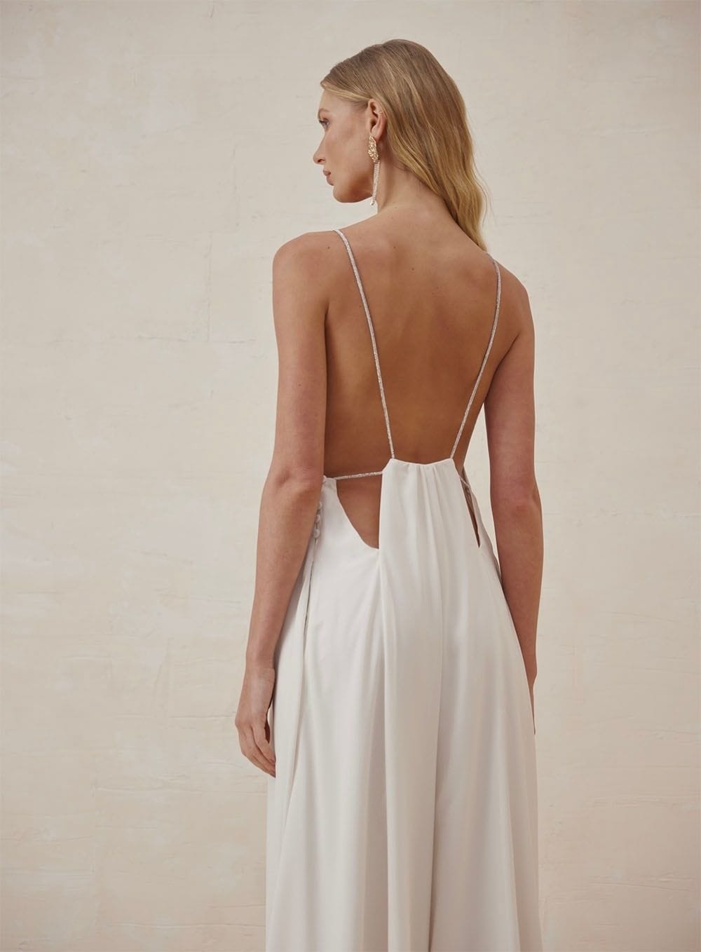 Inspiração & Materiais: resortwear com linho e malhas suaves, tule leve e viscose/modal; drapeados precisos, babados discretos e metais orgânicos em paleta natural (areias, verdes, terrosos e solares).