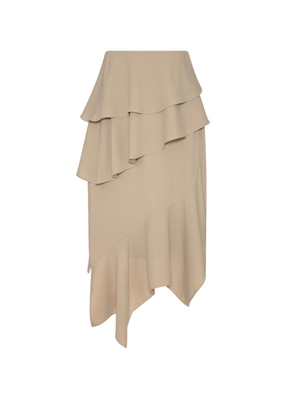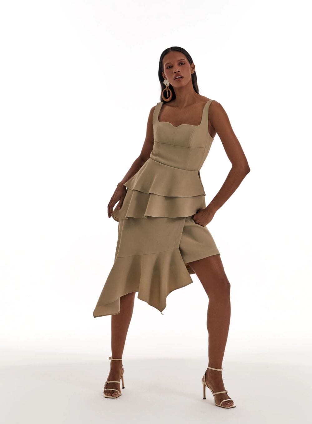 A Saia Micarla é confeccionada em tecido plano, uma alfaiataria dublada, opaca e creponada de um lado, brilhosa e macia na outra face. Comprimento midi, possui detalhes de camadas sobrepondo babados diagonais. Seu fechamento é com zíper.