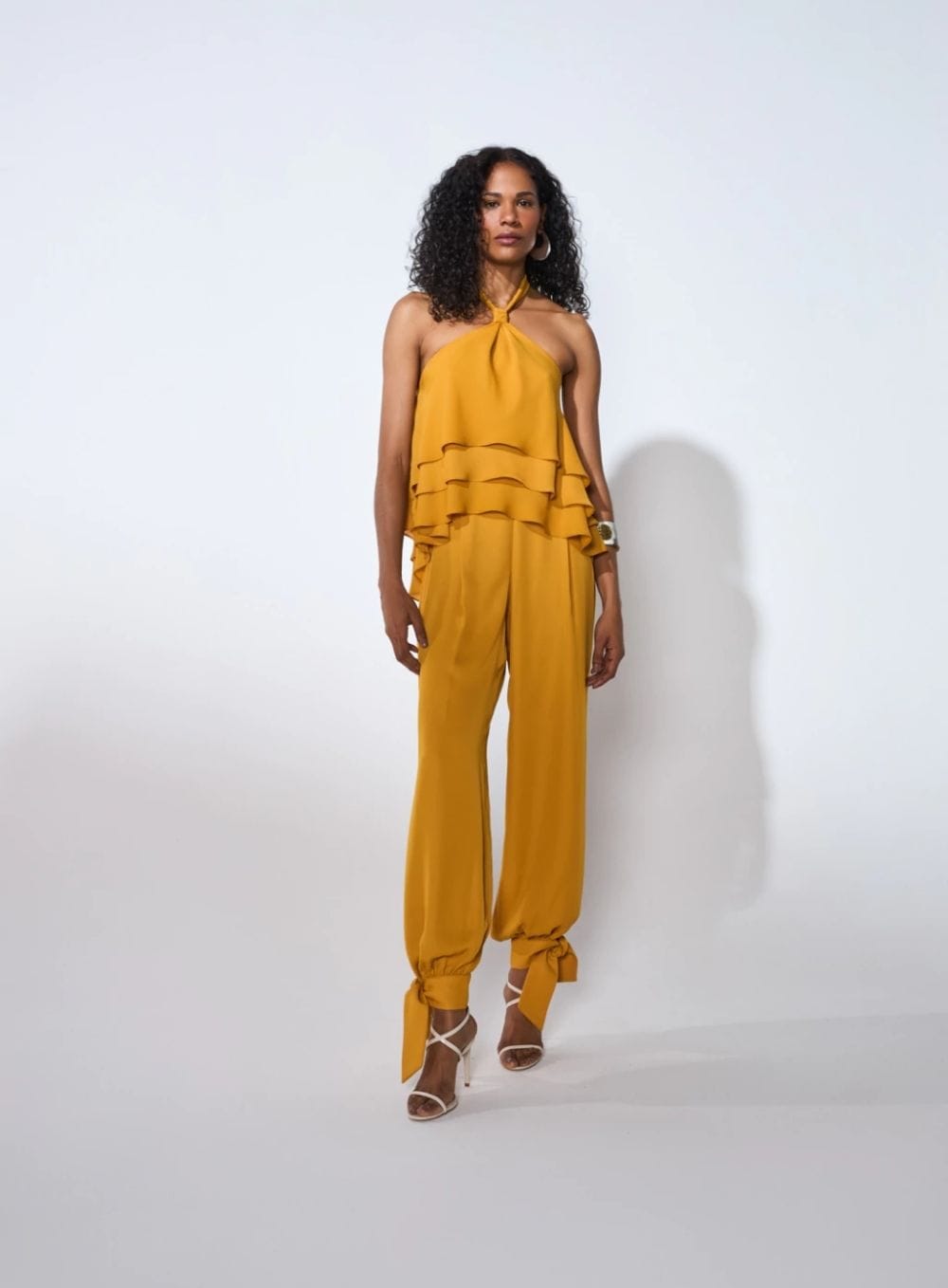 O Top Luiza é a peça que traduz o romantismo boho em versão sofisticada. Confeccionado em chiffon leve e fluido, traz modelagem frente única com camadas delicadas de babados, que criam movimento e frescor em cada detalhe.