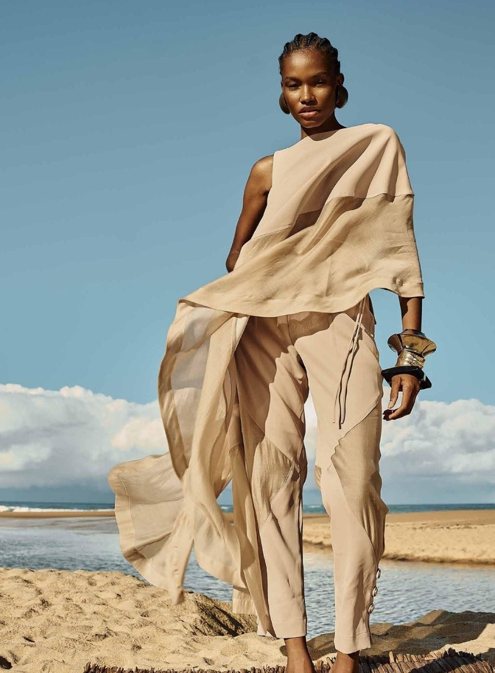 O mix de materiais confere modernidade à peça, enquanto o design assimétrico traz um toque artístico e feminino. Ideal para eventos ao pôr do sol, ocasiões especiais ou produções resort refinadas, este vestido exala elegância com liberdade — para mulheres que se movem com autenticidade.