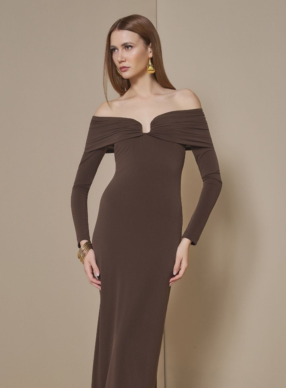Vestido Midi Decote Malha Gloss Choco