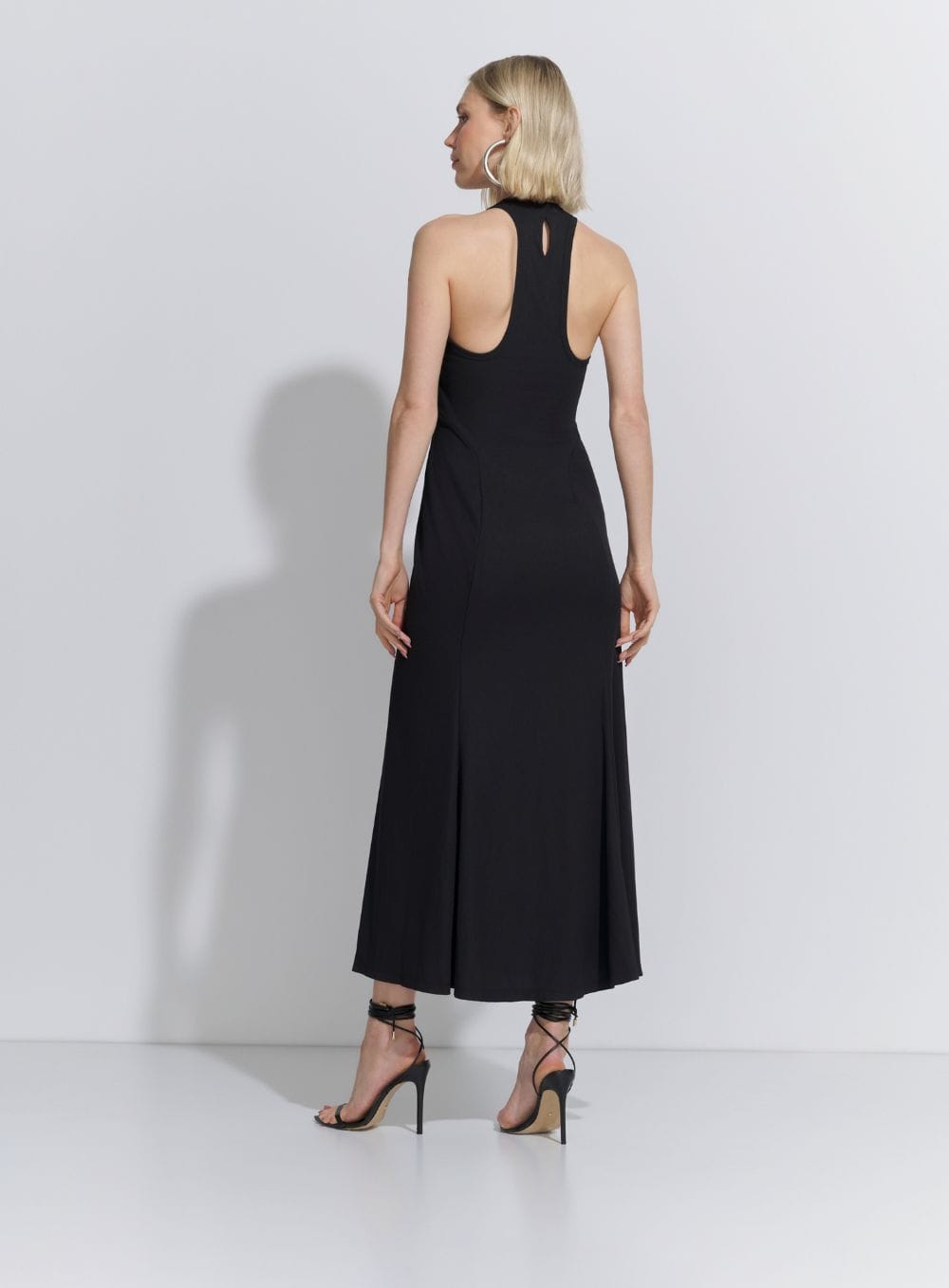 O vestido preto em malha ribana é a escolha ideal para quem busca sofisticação com um toque contemporâneo. Os recortes nas laterais e costas criam um efeito alongador, enquanto o botão bombê no fechamento garante charme ao acabamento. A cor marinho traz elegância sem esforço e transita bem do dia à noite. Combine com mule de salto ou scarpin claro para um look fresh e refinado.