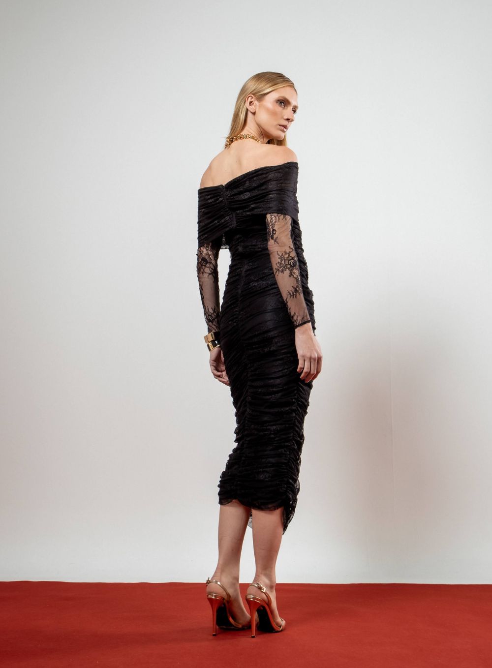 O Vestido Midi Sarah é a definição de elegância escultural: inteiro em renda delicada, com franzidos que envolvem o corpo de forma impecável.