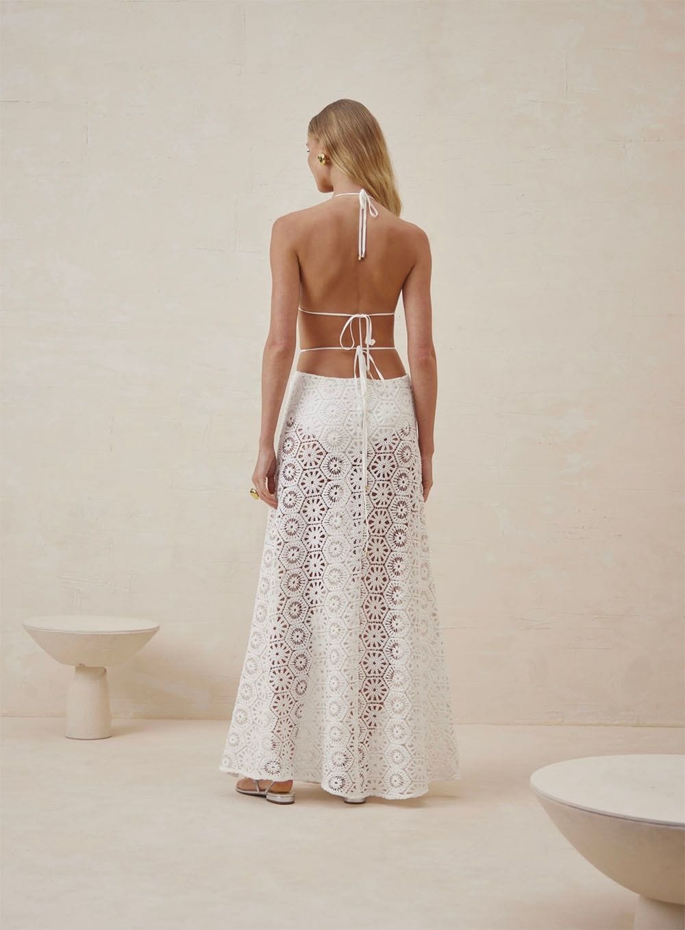 O vestido apresenta shape reto e modelagem slim. A peça possui decote frente único forrado, tiras embutidas no decote frente formando amarração no pescoço, barra do busto com tira abraçando aviamento formando amarração nas costas, cintura forrada com elástico, calcinha estilo hot pant, zíper semi invisível no centro do traseiro e fenda lateral esquerda.