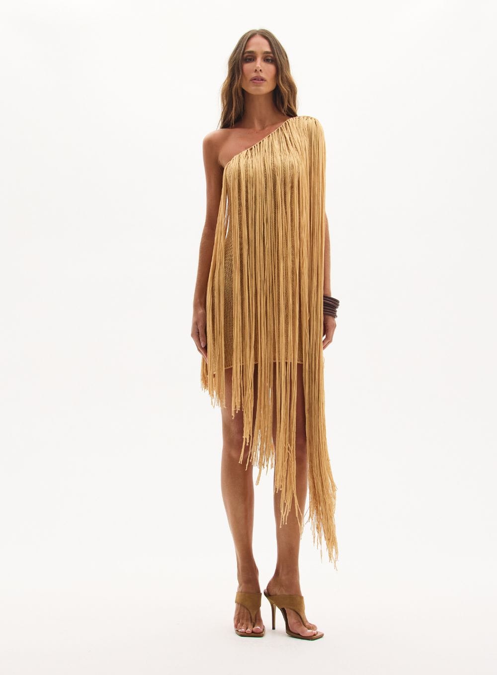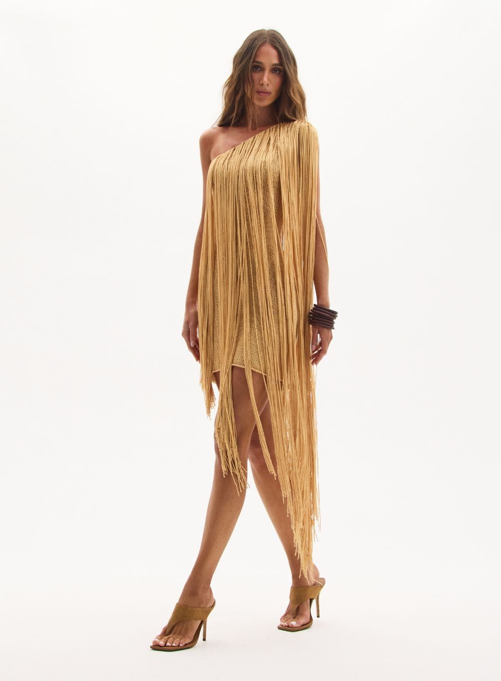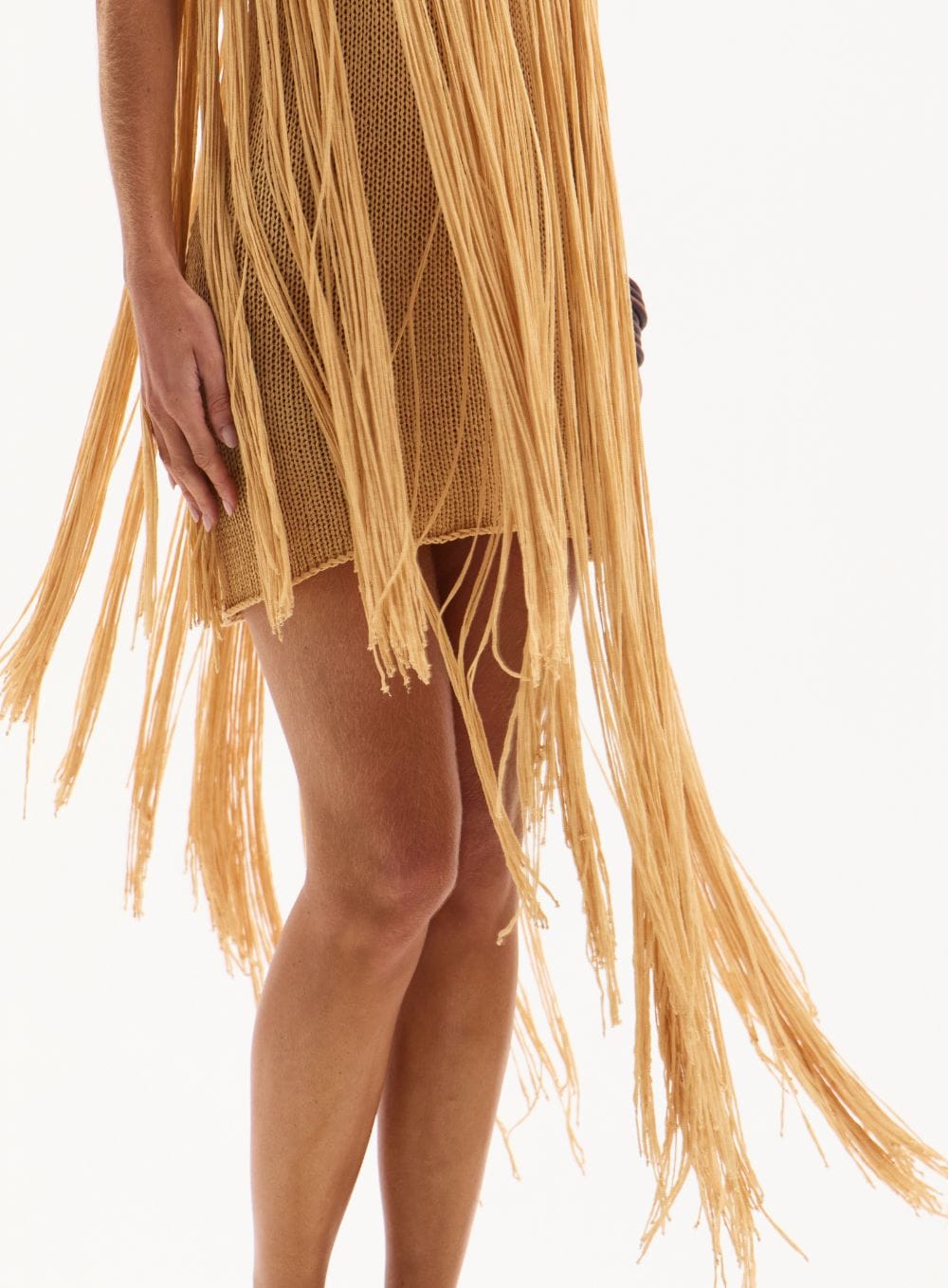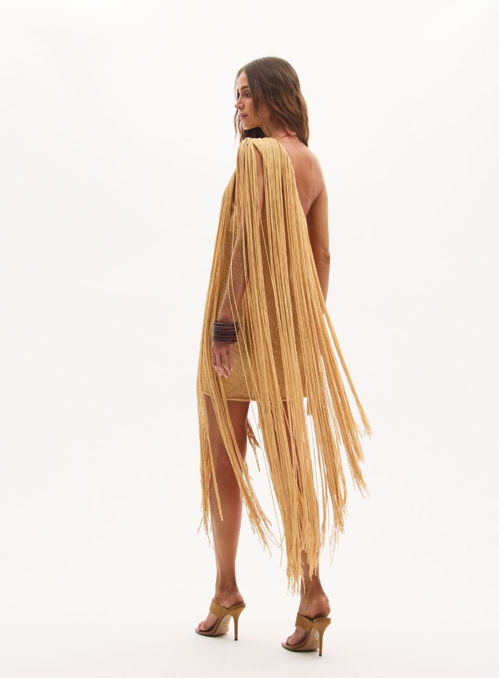 O Vestido Luciane é uma obra de arte têxtil. Para deixar que o movimento das franjas seja o protagonista, combine com sandálias de salto fino e tons neutros. Acessórios em madeira ou resina escura criam um contraste elegante com o ocre solar. Ideal para eventos ao pôr do sol, festas em resorts ou celebrações sofisticadas à beira-mar onde a presença marcante é essencial.